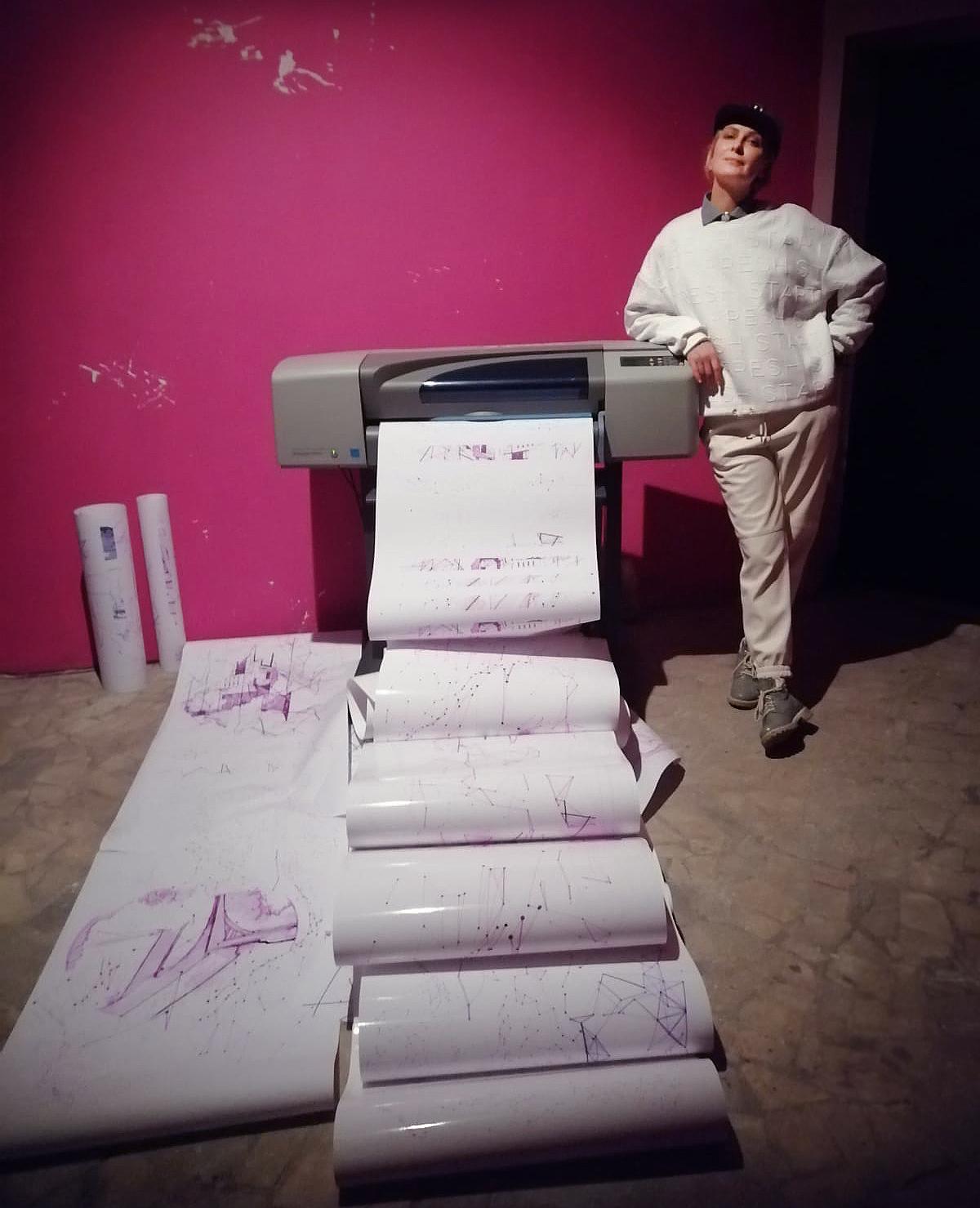 However, the robot's processor malfunctions and its illustrations turn into abstract glitch art; they are output on the printer as black and white line graphs. The mechanical sounds made by the old inkjet printer from the 1970s are just as important, as they are another "sonic" version of image transmission. Together, these two attempts at visualization create a palimpsest of the picture of the future.