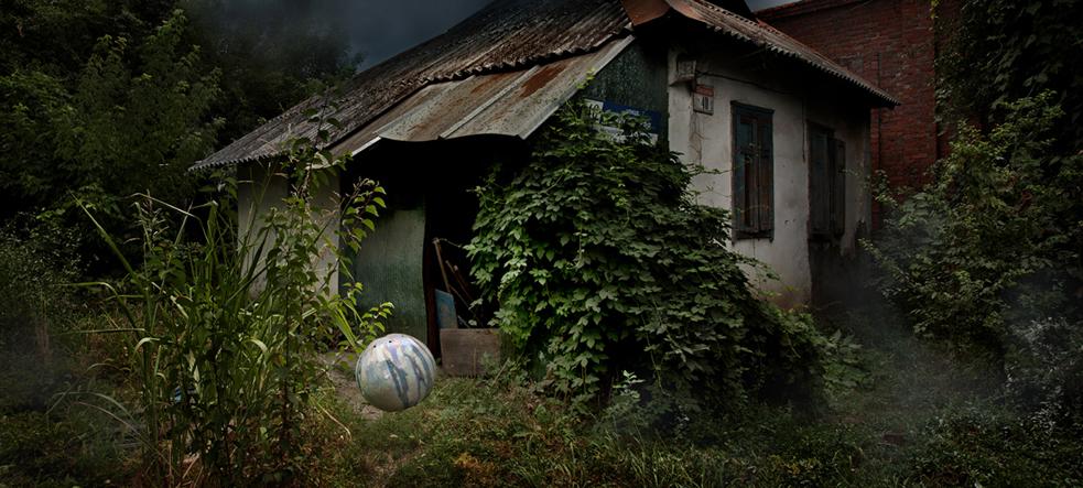 In the project «FormTransfer», the author is theorizing on the subject of migration. The author contrasts his characters with quality, structure, texture and geometric shape. A soaring object surrounded with the landscape, so native but neglected, symbolizes memories of a migrant. This object breaks the harmonious impression made by the view of a deserted place. It shows us a person's bodily remembrance recurring to the family home. Nowadays we can find completely abandoned settlements. An individual migrates to a progressive megapolis to improve his social rank, seeking for more comfortable living, wealth, opportunity of cultural development. He experiences archaic traumas, which force him to leave his family home and find another place to settle down.