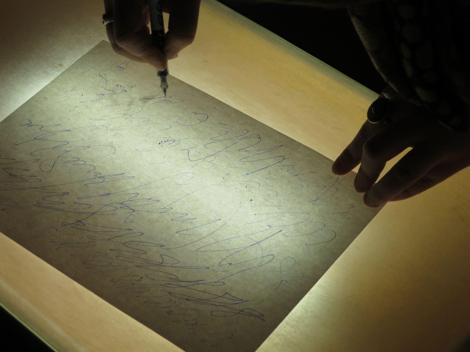 Moving in this direction, Danita Pushkareva decides to transfer this idea to the space of new technologies. For performance there was created a special light and sound instrument, it allows to recode the process of writing into sound. The upper part of this table is a transparent plastic membrane. The recording camera is located directly above this membrane, so that only the hand writing (drawing) the text of the automatic letter is visible in the video picture. On the lower part of this membrane a contact microphone is fixed, which in parallel records the "sound of the letter" with the help of a special computer program. The final documentation is a video with the superimposed soundtrack of the "sound of the letter".